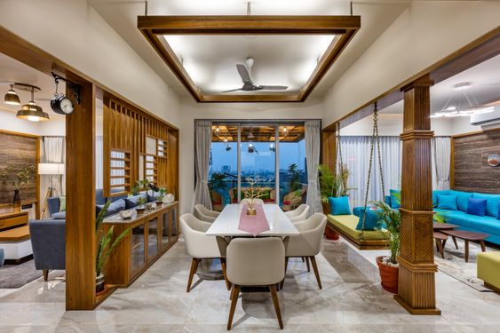 The living and dining areas were designed to promote openness and fluid interaction between spaces. Custom-crafted partitions and wooden detailing introduce visual structure without compromising the sense of spaciousness. The ceiling design, integrated with soft indirect lighting, adds depth and architectural character while creating a welcoming atmosphere.
