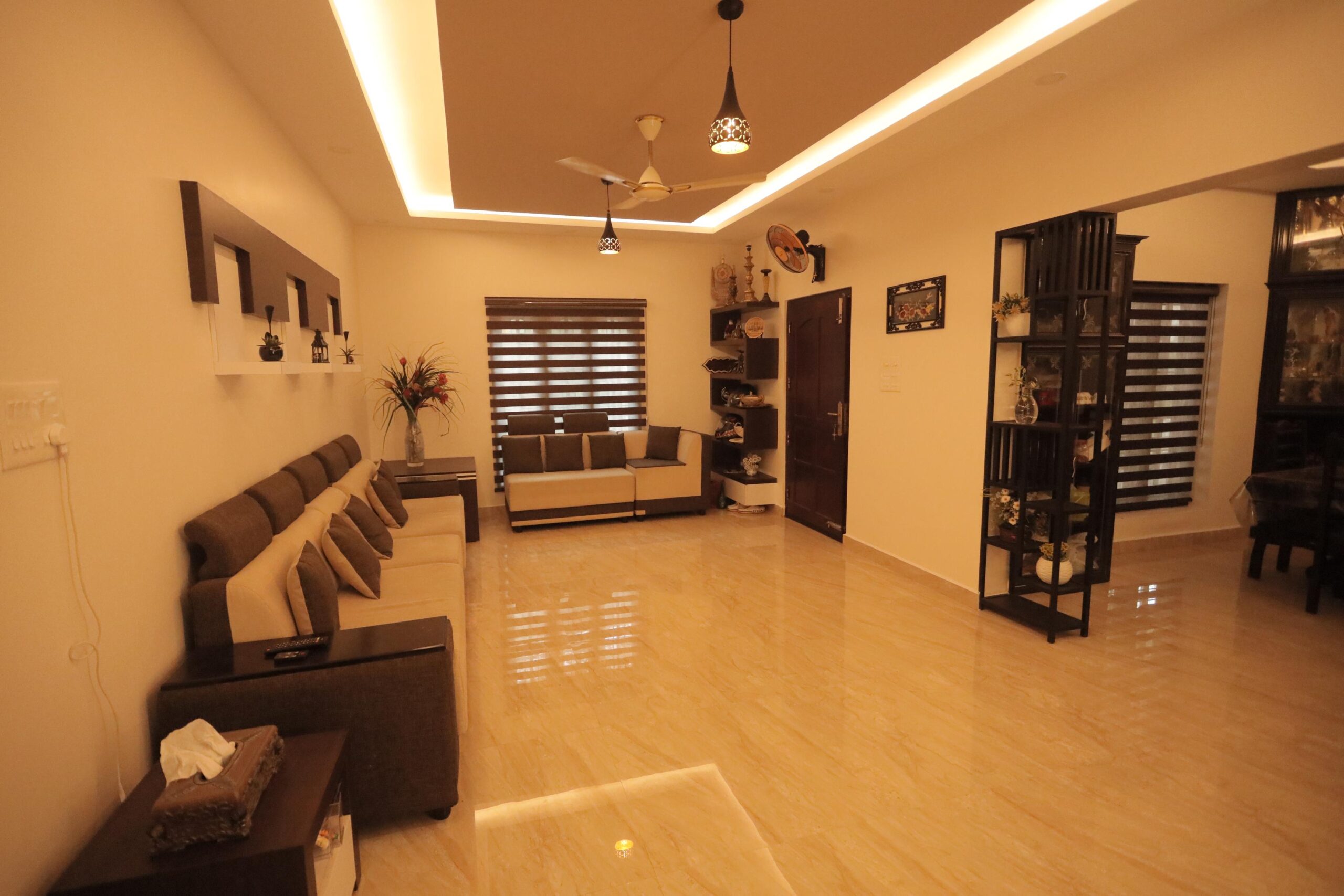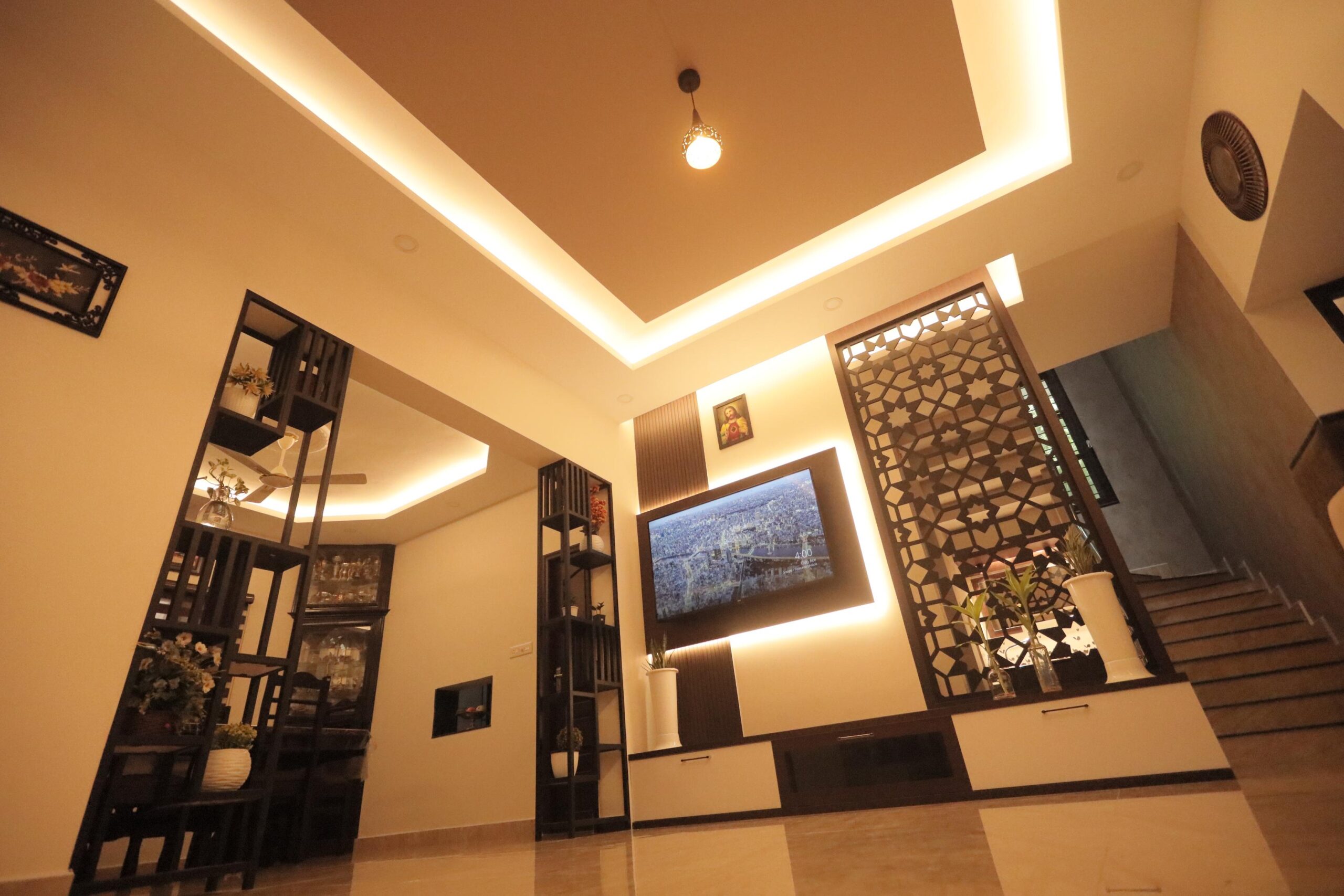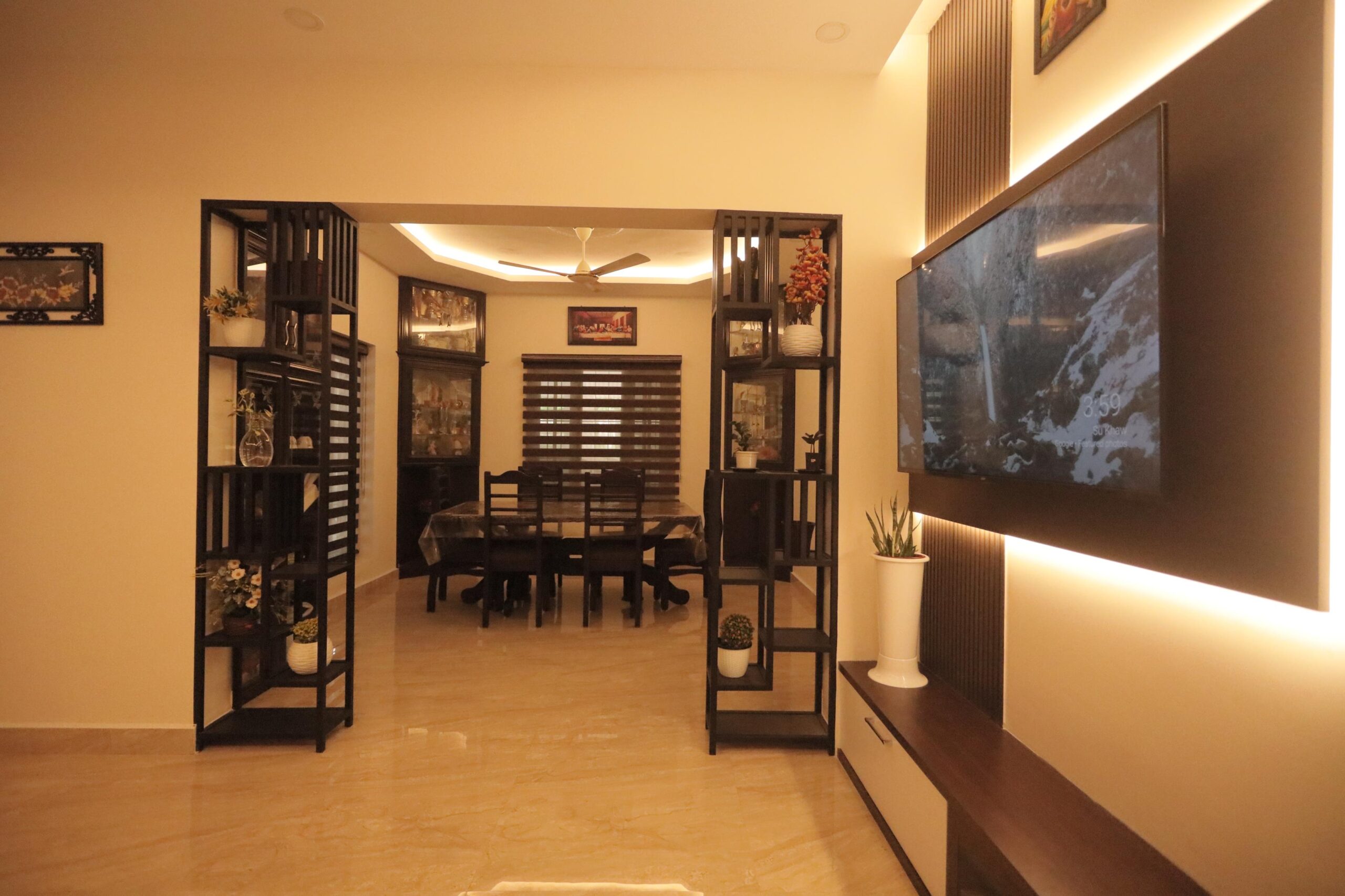 Custom-designed elements played a significant role in elevating the interiors. Decorative partitions and display units were thoughtfully integrated to provide visual interest while subtly defining spaces. The ceiling design, complemented by soft indirect lighting, enhances the sense of depth and sophistication across the primary living areas.