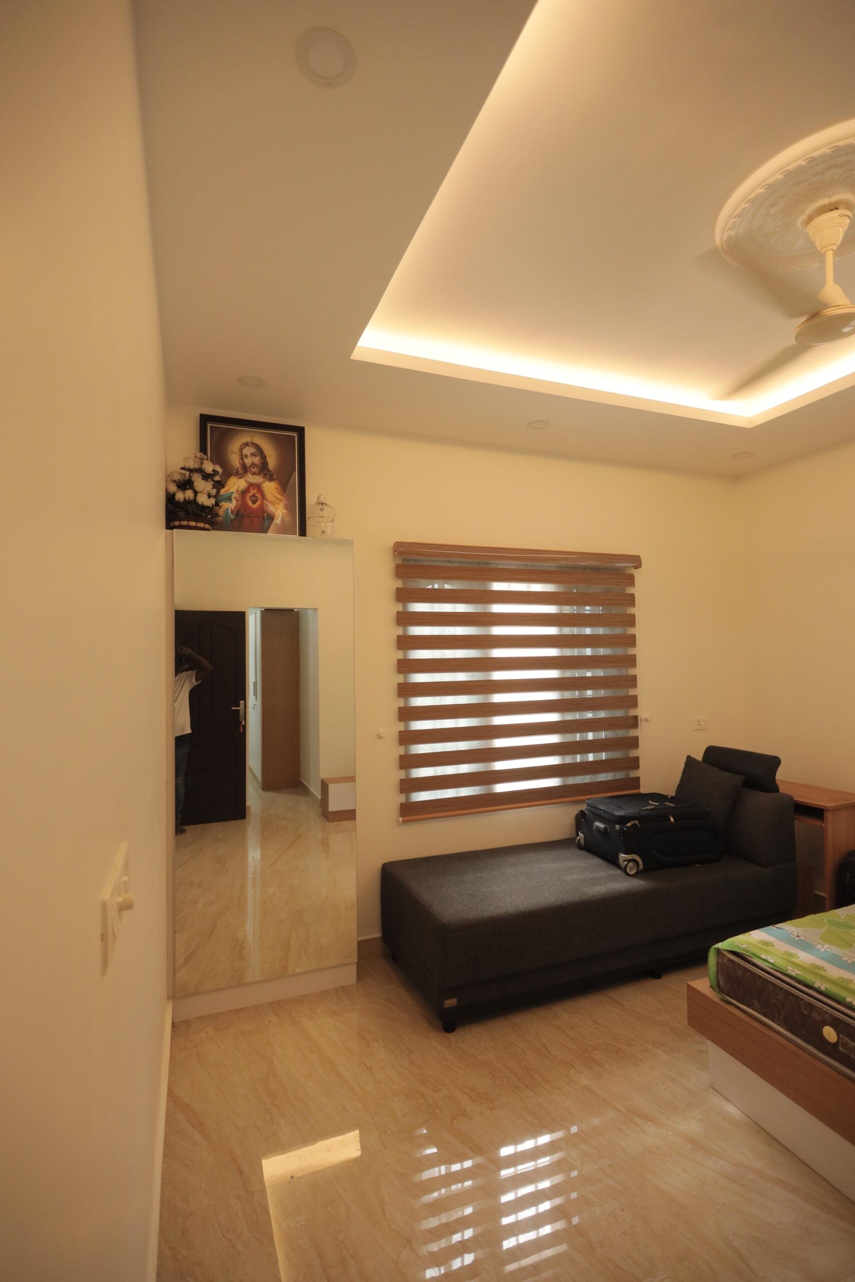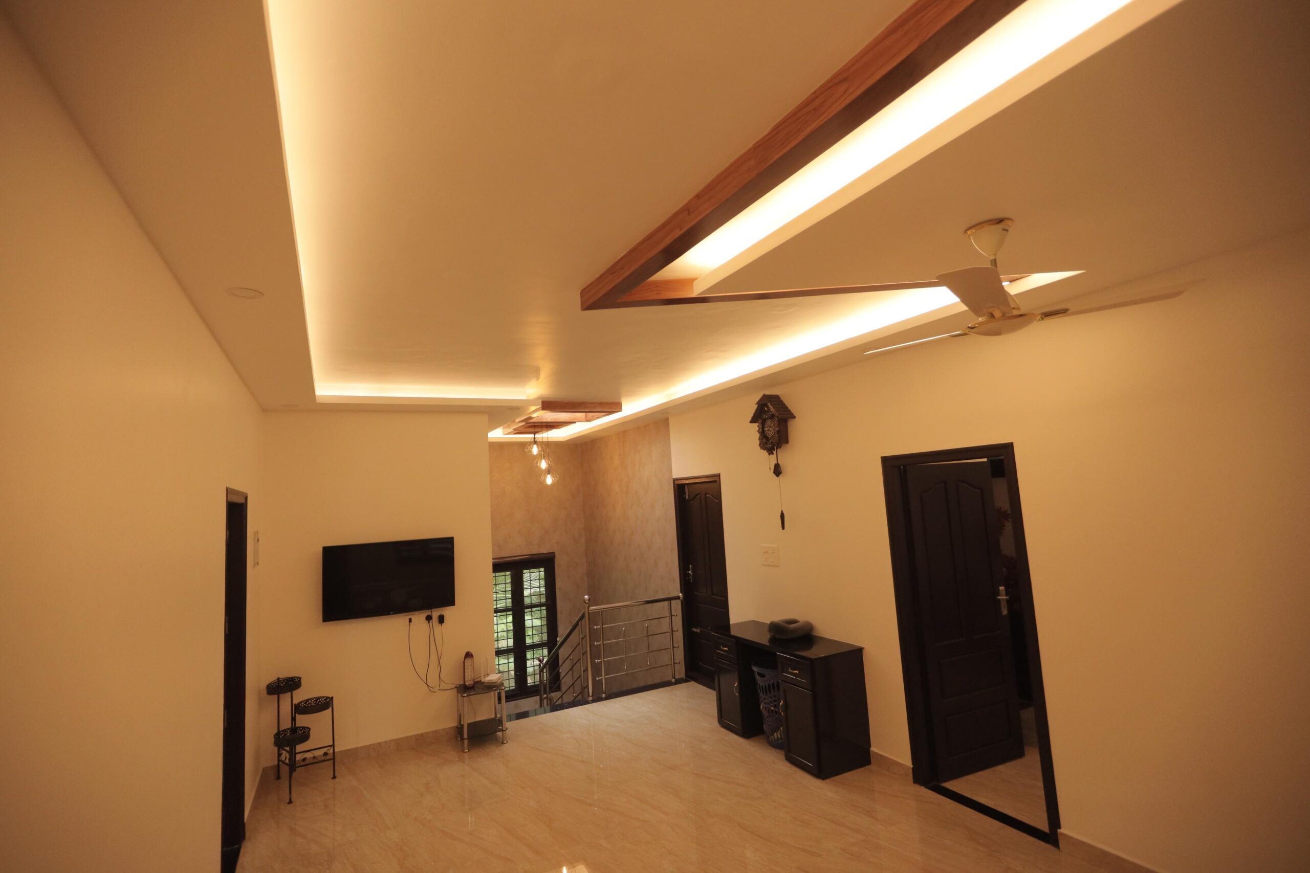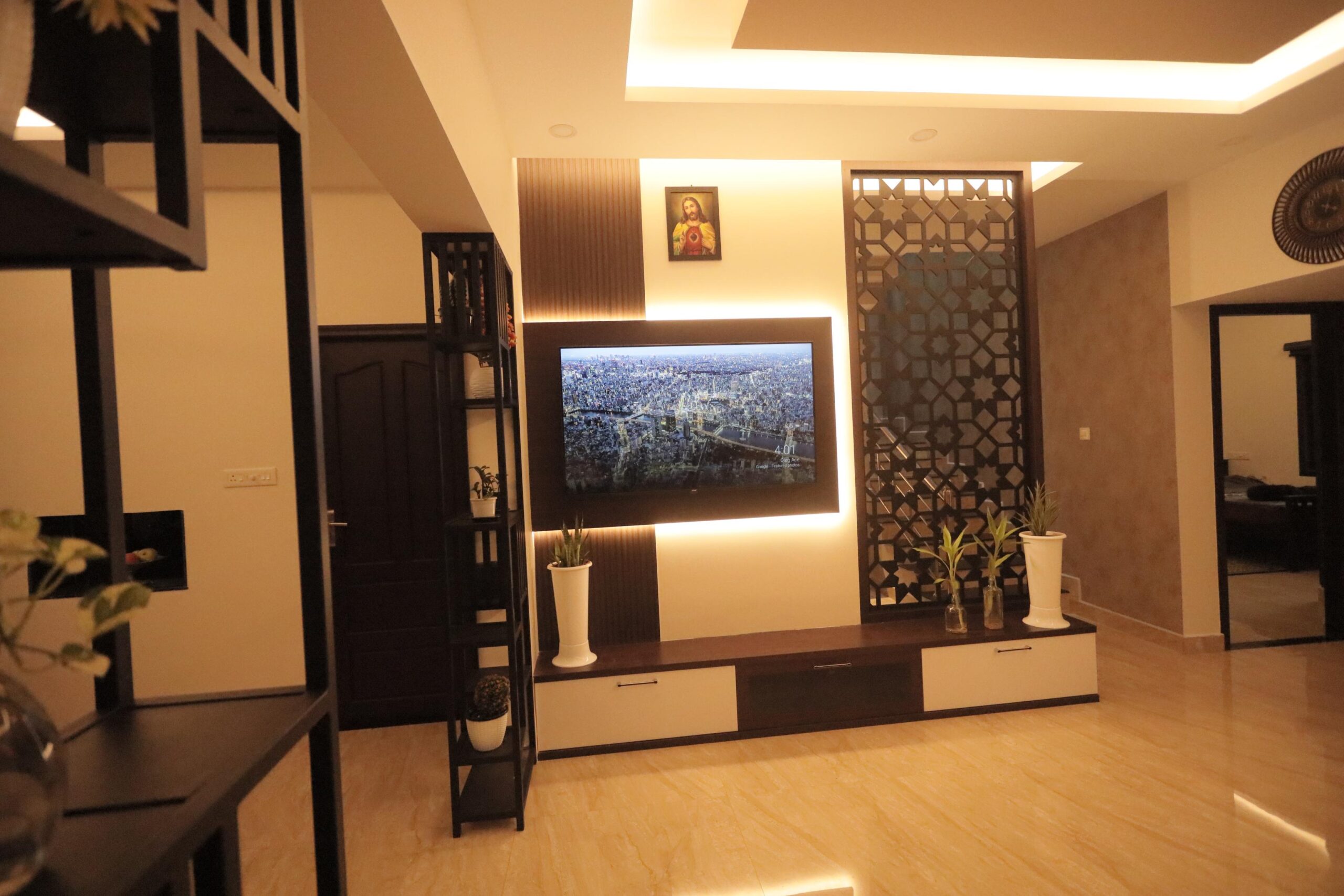 Custom-designed elements played a significant role in elevating the interiors. Decorative partitions and display units were thoughtfully integrated to provide visual interest while subtly defining spaces. The ceiling design, complemented by soft indirect lighting, enhances the sense of depth and sophistication across the primary living areas.